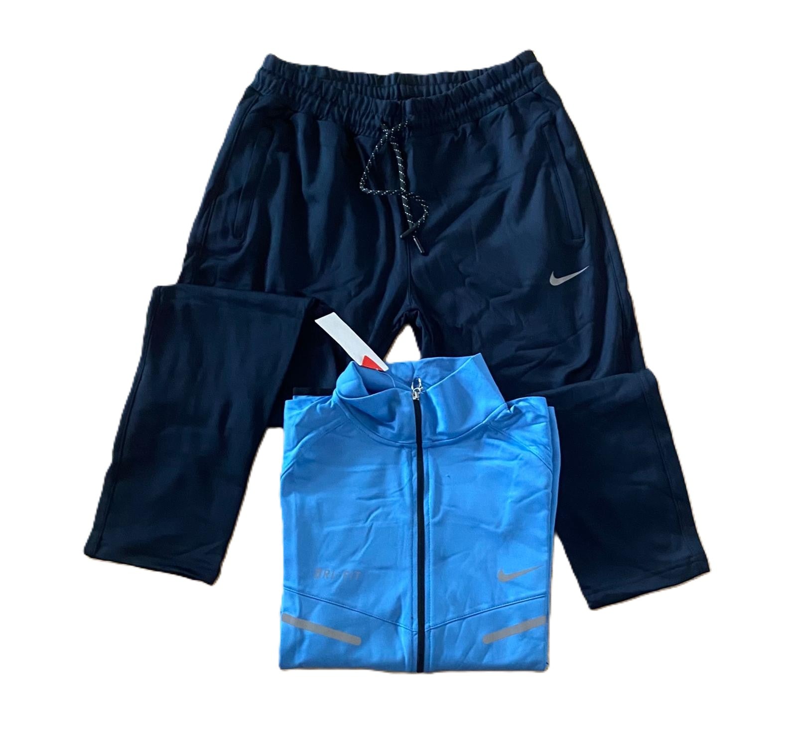 Горнището е с цип и висока яка, с лого Nike и светлоотразителни елементи, които придават динамичен и професионален спортен вид. Долнището е черно, с еластична талия и връзки, подходящо за тренировки или ежедневие.