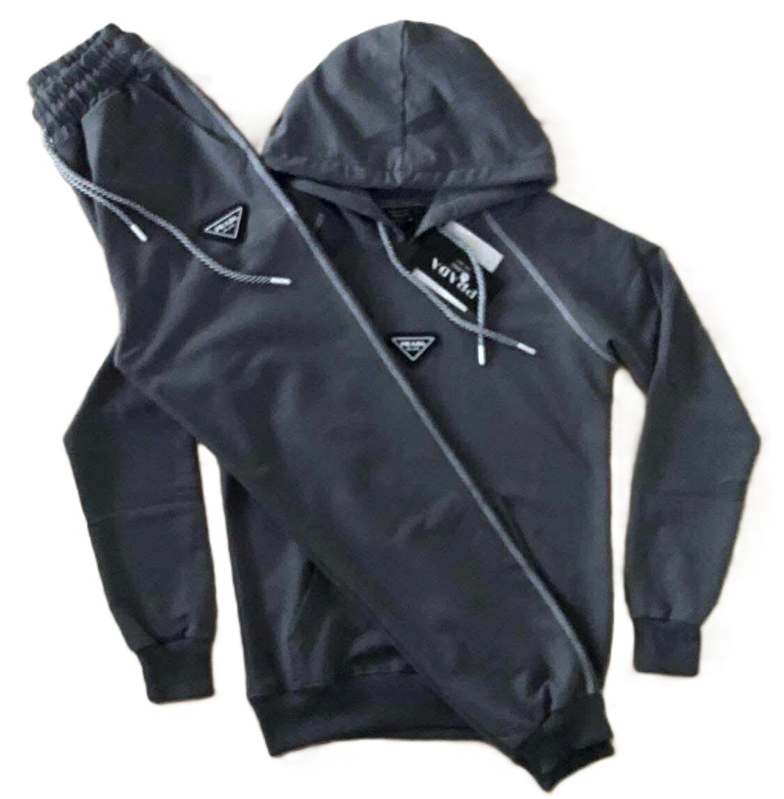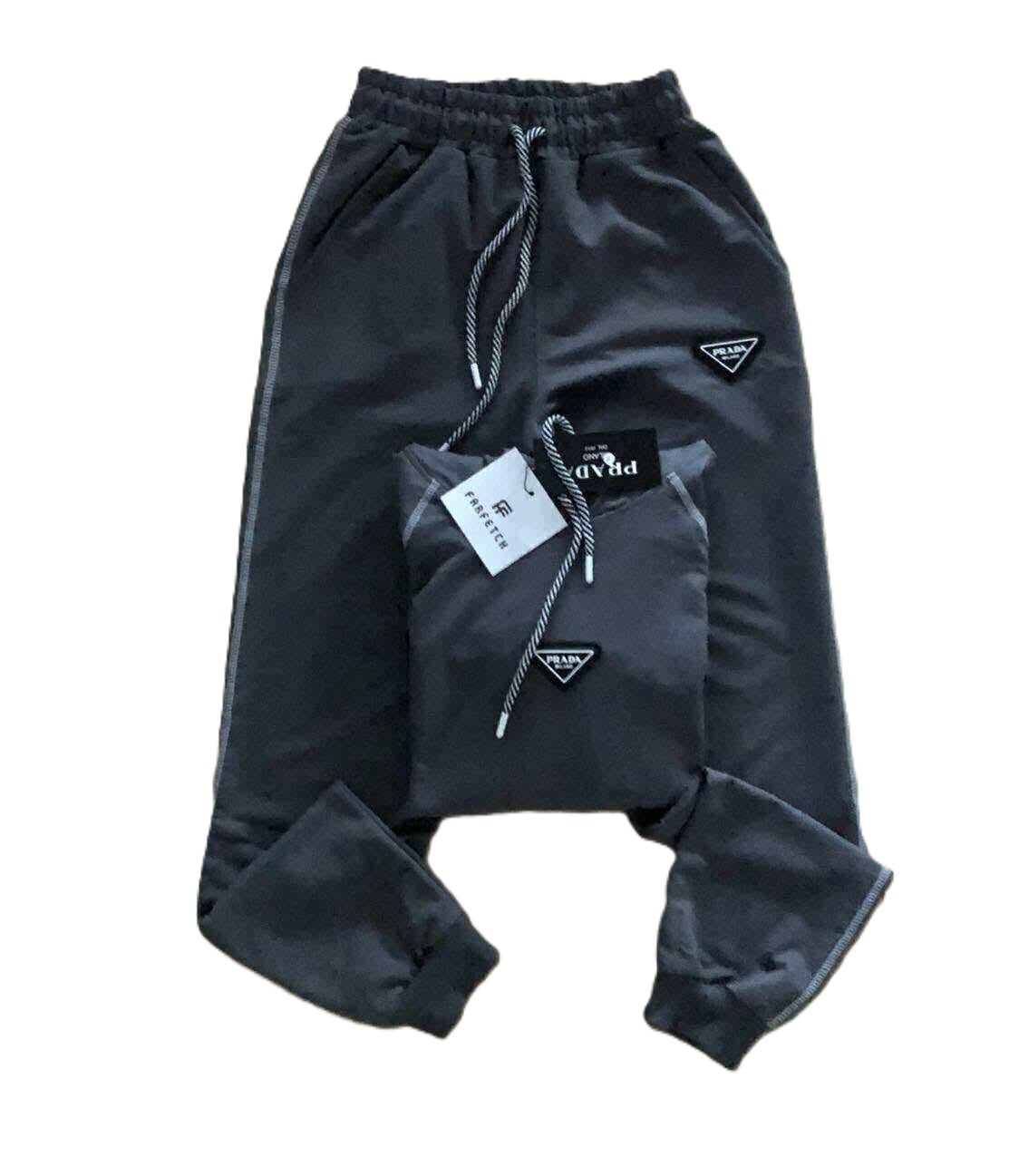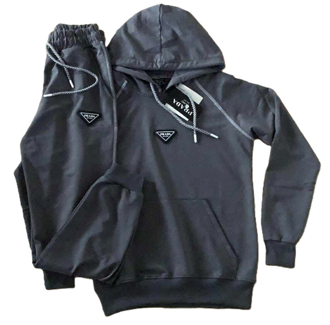 Горната част е с цип и качулка, а долната – с удобна кройка и връзки на талията. И двете части са декорирани с триъгълното лого в стил Prada, което придава модерен и луксозен акцент.